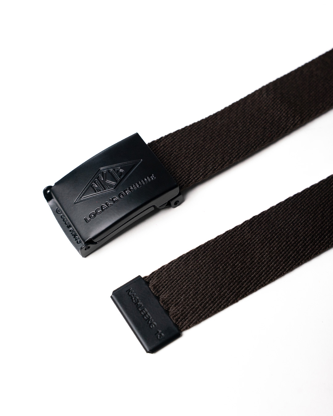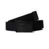 Sliding Metal Plaque Buckle with Logo Branding. Stretch Side to Side for Flexibility and Comfort. Blunt Metal Tip End.
