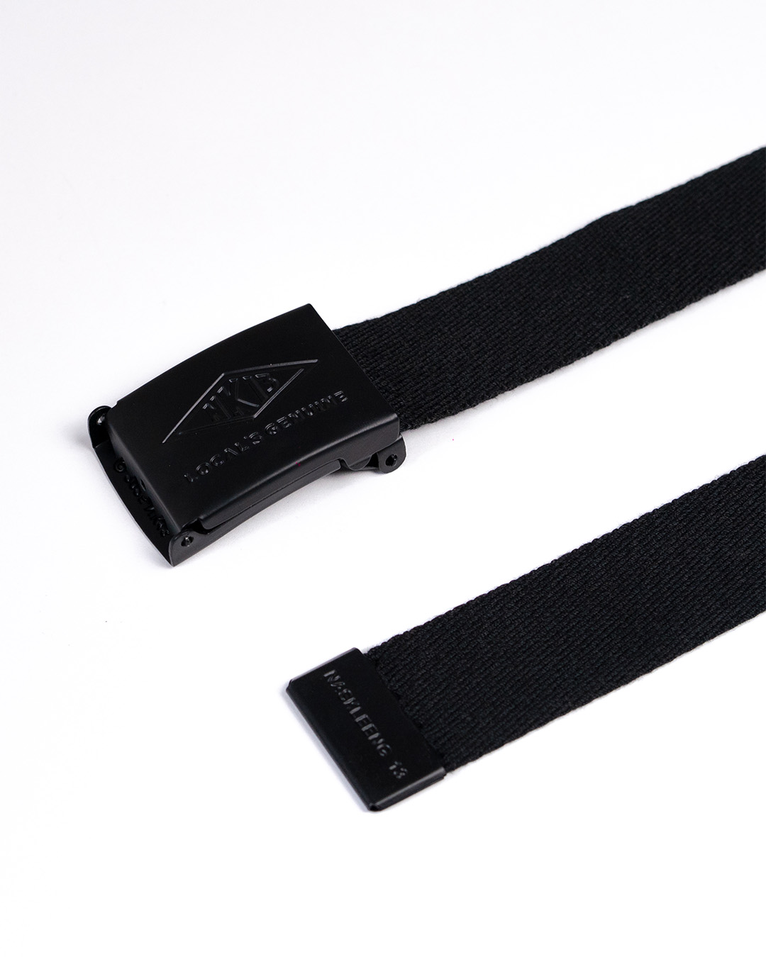 Sliding Metal Plaque Buckle with Logo Branding. Stretch Side to Side for Flexibility and Comfort. Blunt Metal Tip End.